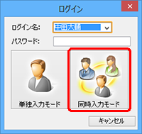 複数のユーザーで同時に請求書や見積書を入力する場合は、製品起動時に表示される[ログイン]ダイアログで、[ログイン名]と[パスワード]を入力し、[同時入力モード]ボタンをクリックします。
